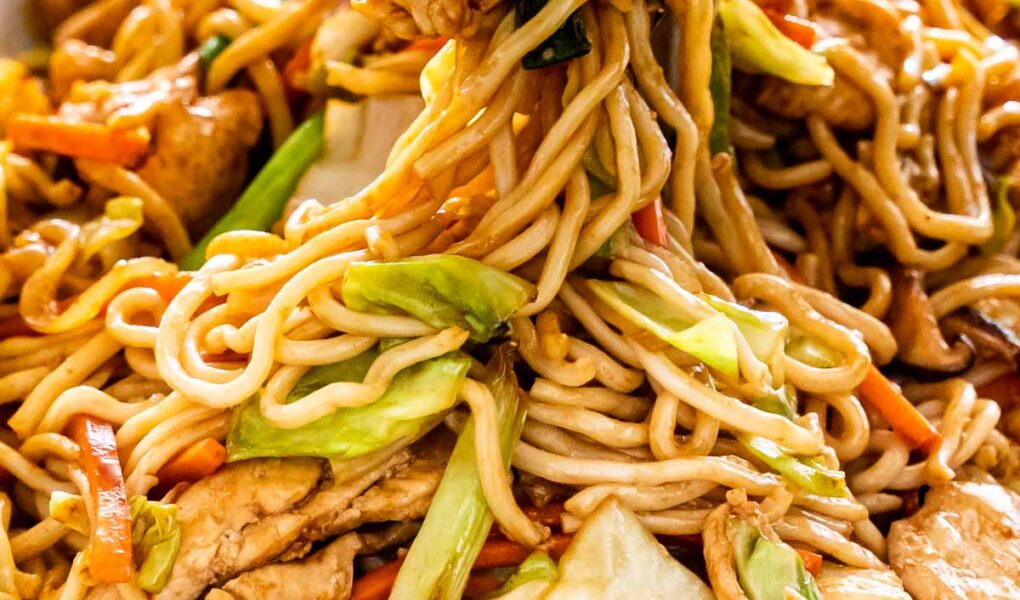 Cozinhe o macarrão em água fervente com uma pitada de sal por 4 minutos. Depois, escorra bem. Em uma panela com azeite, adicione o frango, a carne e deixe fritando até dourarem. Coloque um pouquinho de água para não correr o risco de queimar e adicione um pouco de shoyu. Depois, acrescente a cebola e a cenoura e mexa e deixe por uns 2 minutos.